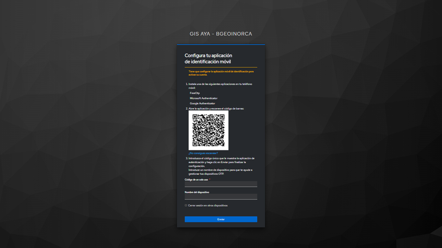 Para la configuración de manejo de identidad, debemos instalar alguna de la aplicaciones de autenticación en su teléfono móvil recomendadas (Microsoft Authenticator, Google Authenticator, FreeOTP ) y escanear el QR que les aparece en pantalla, luego en la aplicación del teléfono le va a aparecer registrado con el nombre “Gis AyA - BGEOINORCA”, hacemos clic sobre ello y nos aparecerá un código de un solo uso que es el que colocará en el paso 3.